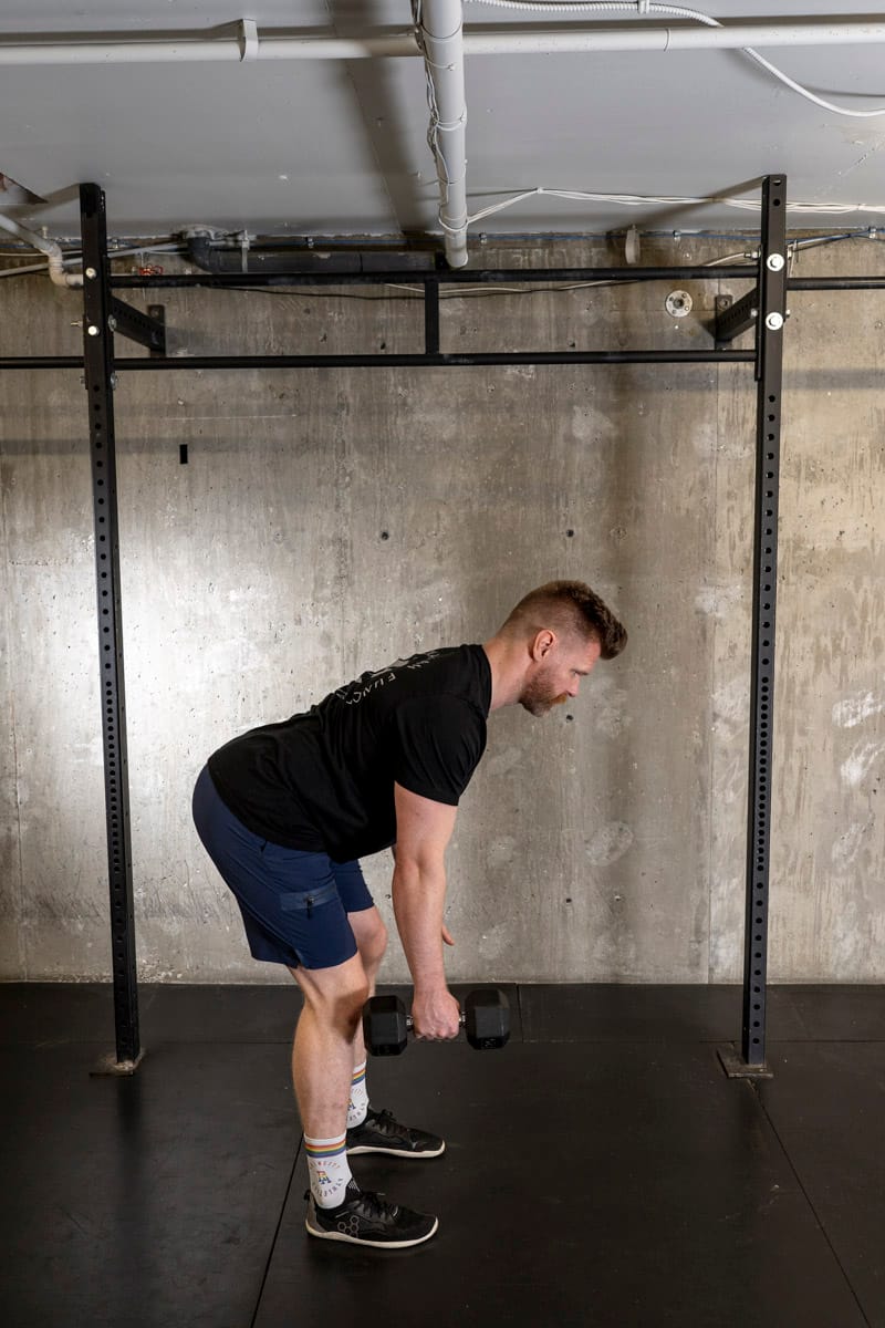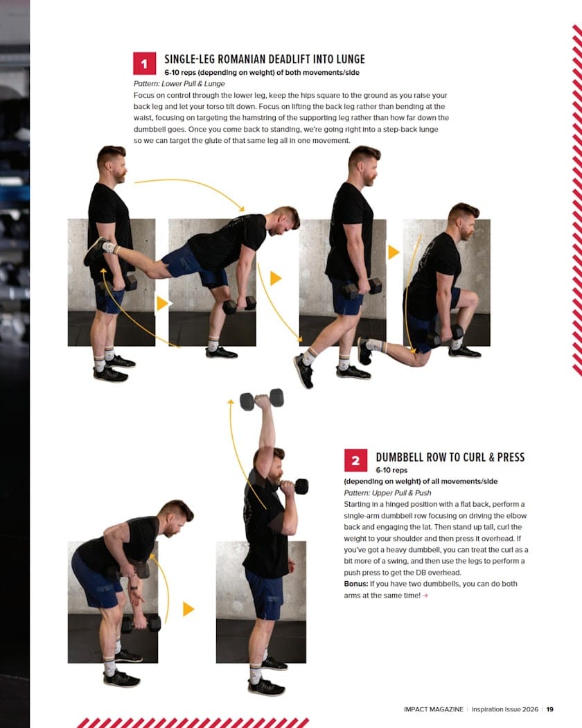 Starting in a hinged position with a flat back, perform a single-arm dumbbell row focusing on driving the elbow back and engaging the lat. Then stand up tall, curl the weight to your shoulder and then press it overhead. If you’ve got a heavy dumbbell, you can treat the curl as a bit more of a swing, and then use the legs to perform a push press to get the DB overhead.