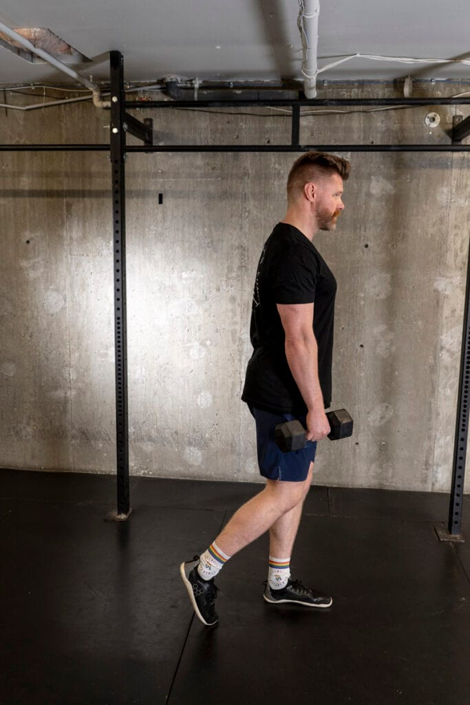 Focus on control through the lower leg, keep the hips square to the ground as you raise your back leg and let your torso tilt down. Focus on lifting the back leg rather than bending at the waist, focusing on targeting the hamstring of the supporting leg rather than how far down the dumbbell goes. Once you come back to standing, we’re going right into a step-back lunge so we can target the glute of that same leg all in one movement.