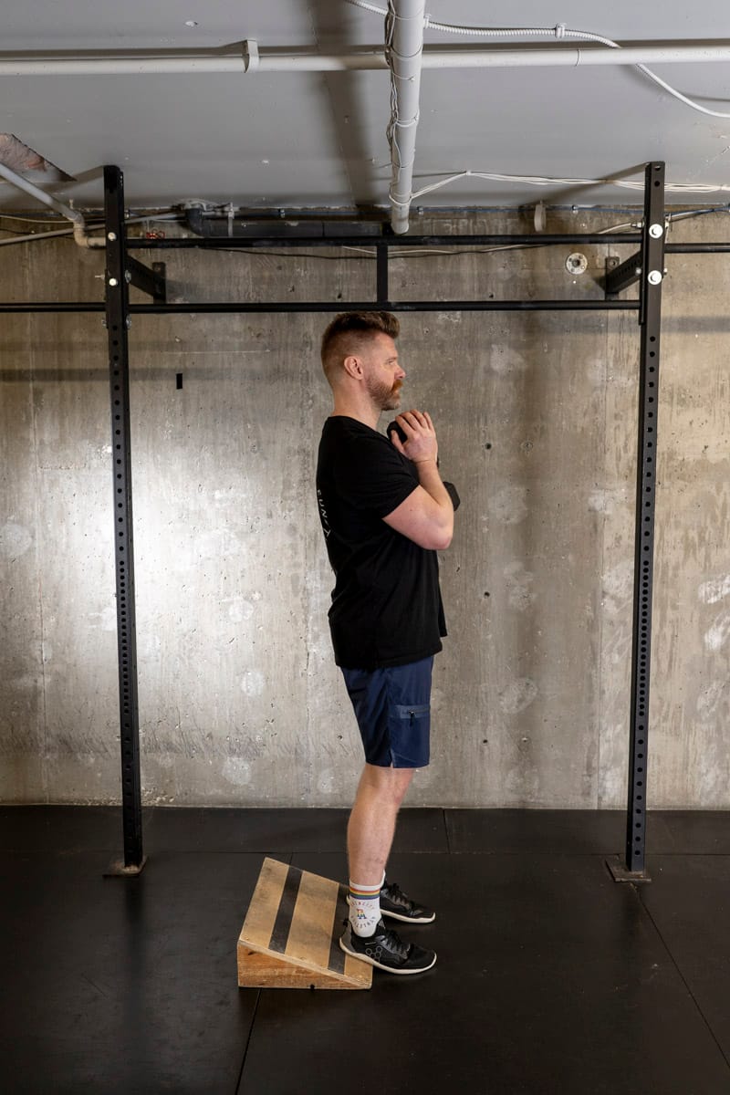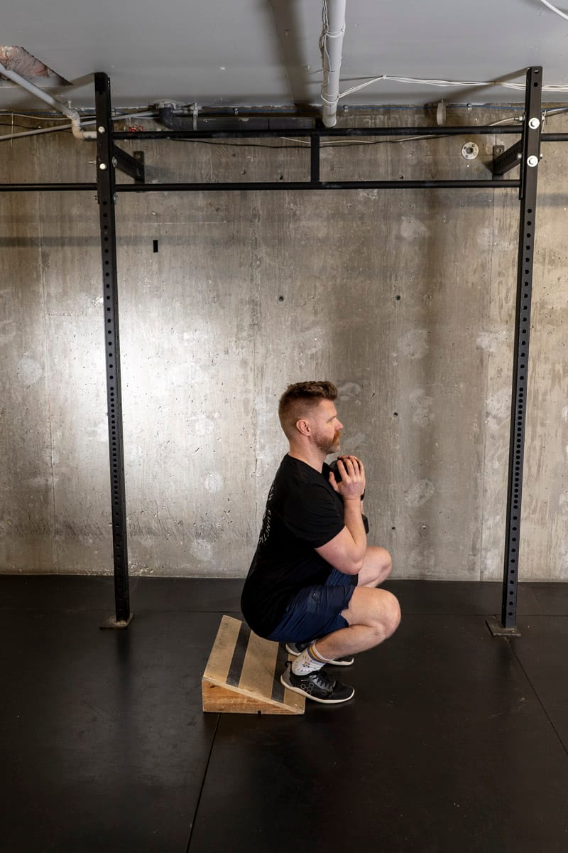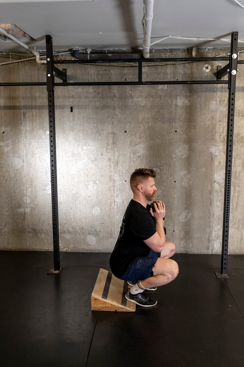 The reason we use a cyclist squat (heals elevated) over a conventional squat is we’ve already targeting the hamstrings and glutes – so in this move we’re trying to get into DEEP knee flexion to ensure longevity and healthy knees while also targeting the quadriceps more specifically. Elevate your heels with whatever you’ve got that’s one to two inches tall!
