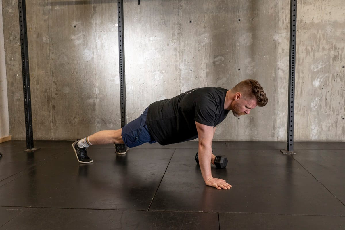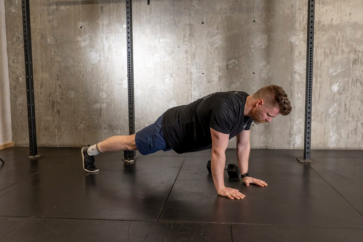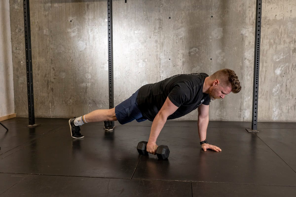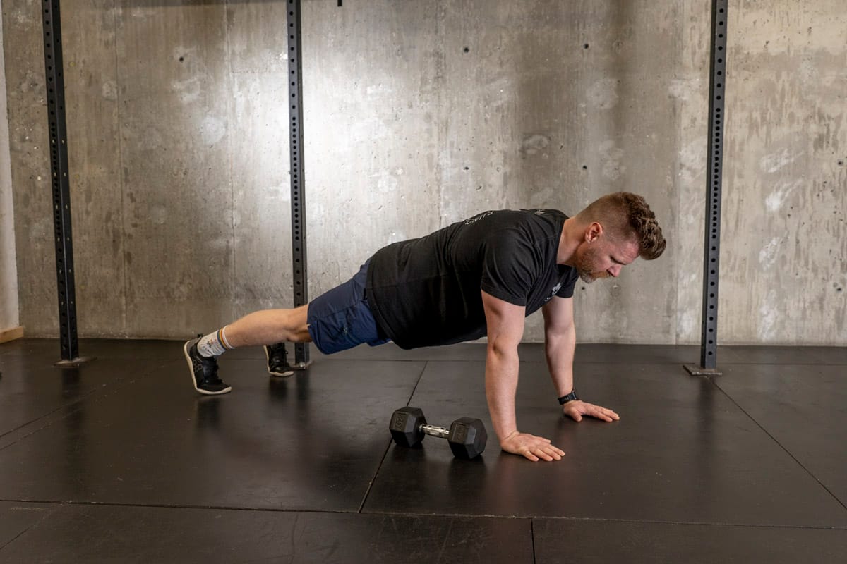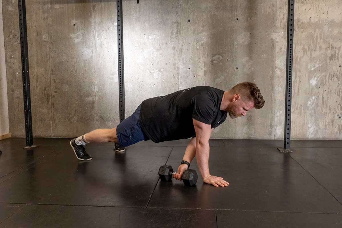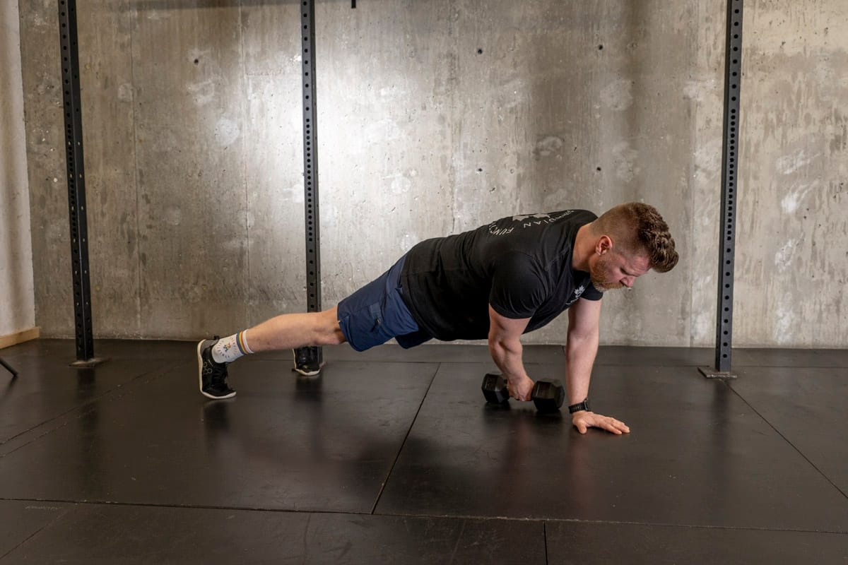 Starting in a tall plank position you’re going to drag the weight across the floor by pulling it (not pushing it) while trying to minimize the movement through your torso. If you’ve got a lot of butt movement going on widen your stance, if it’s too easy bring your feet closer together! This movements not only great for targeting the core and obliques but also helps strengthen our upper back and scapula which helps with mobility and posture as well.