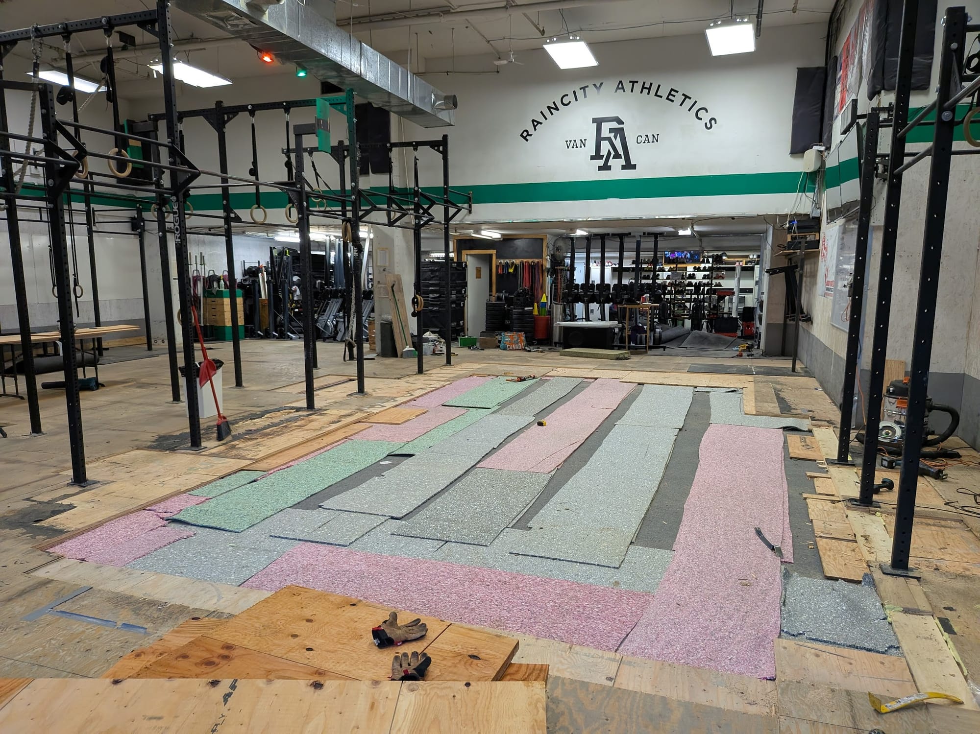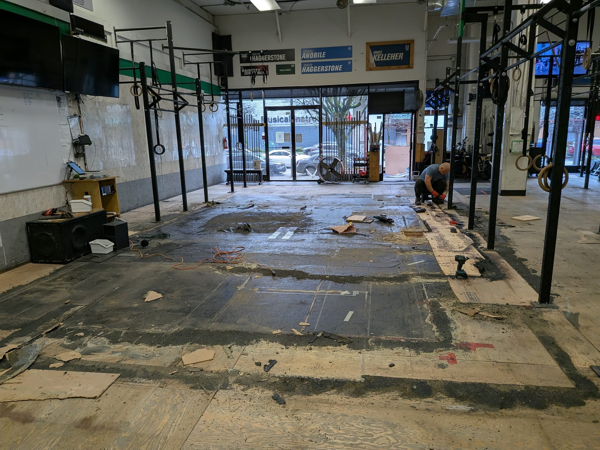 Over the next five to seven years, I spent almost every Christmas and Boxing Day at Raincity trying to fix issues with our lumpy subfloor. I refused to close Raincity for more than two days, so all renovation work happened on Christmas Day and Boxing Day. I assumed the lumps had formed from years of heavy barbell drops, liquid from floor mopping, and general wear and tear on the plywood, but I was wrong.