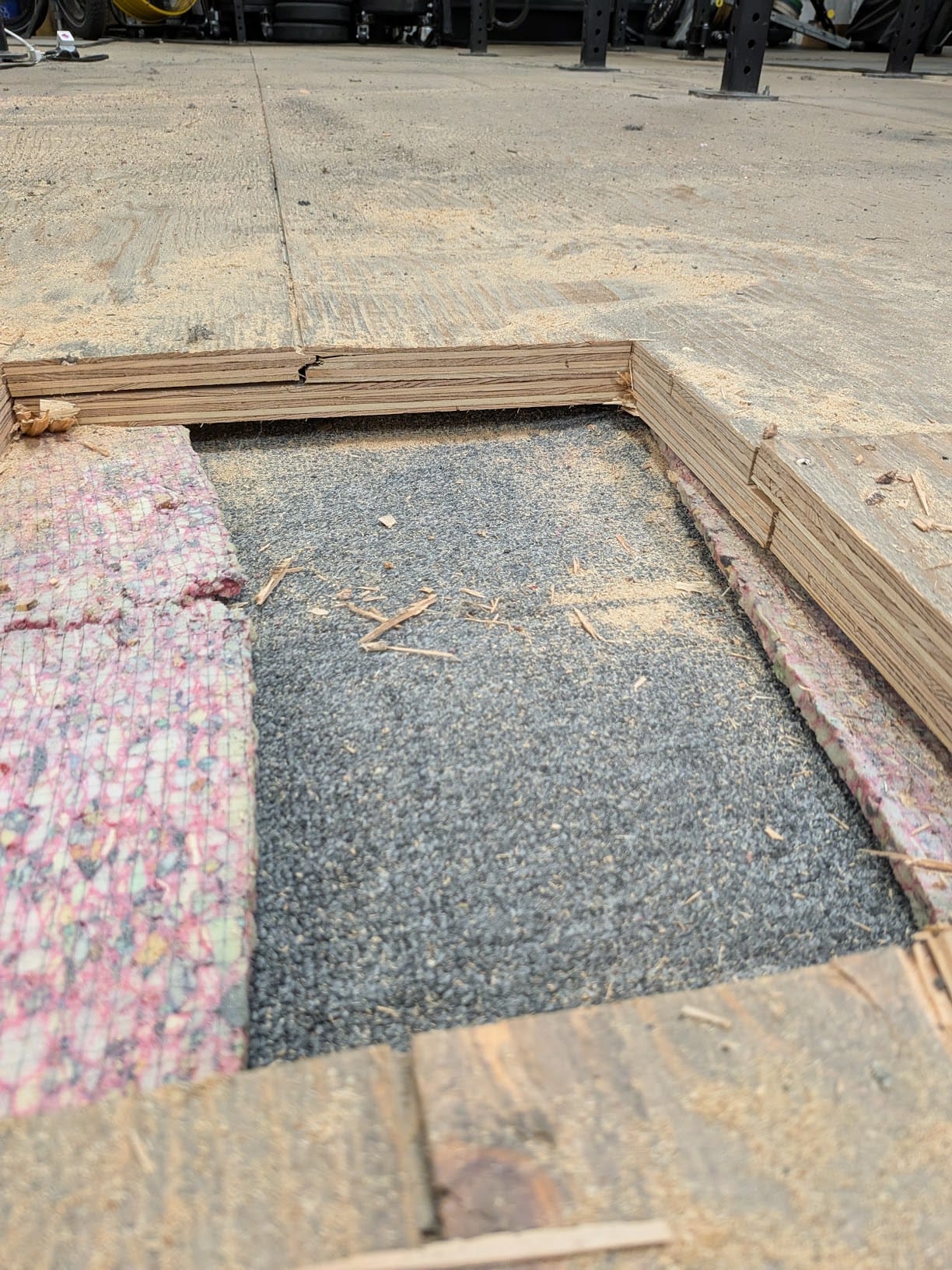 The center of the platforms were solidly supported underneath with wood, as was the perimeter. The middle section of the gym was ¾-inch tongue-and-groove plywood floating on one to two layers of carpet underlay. This wasn’t intended to function like a traditional platform, but rather to dramatically reduce day-to-day drops and slams, which it did... at least for a while.