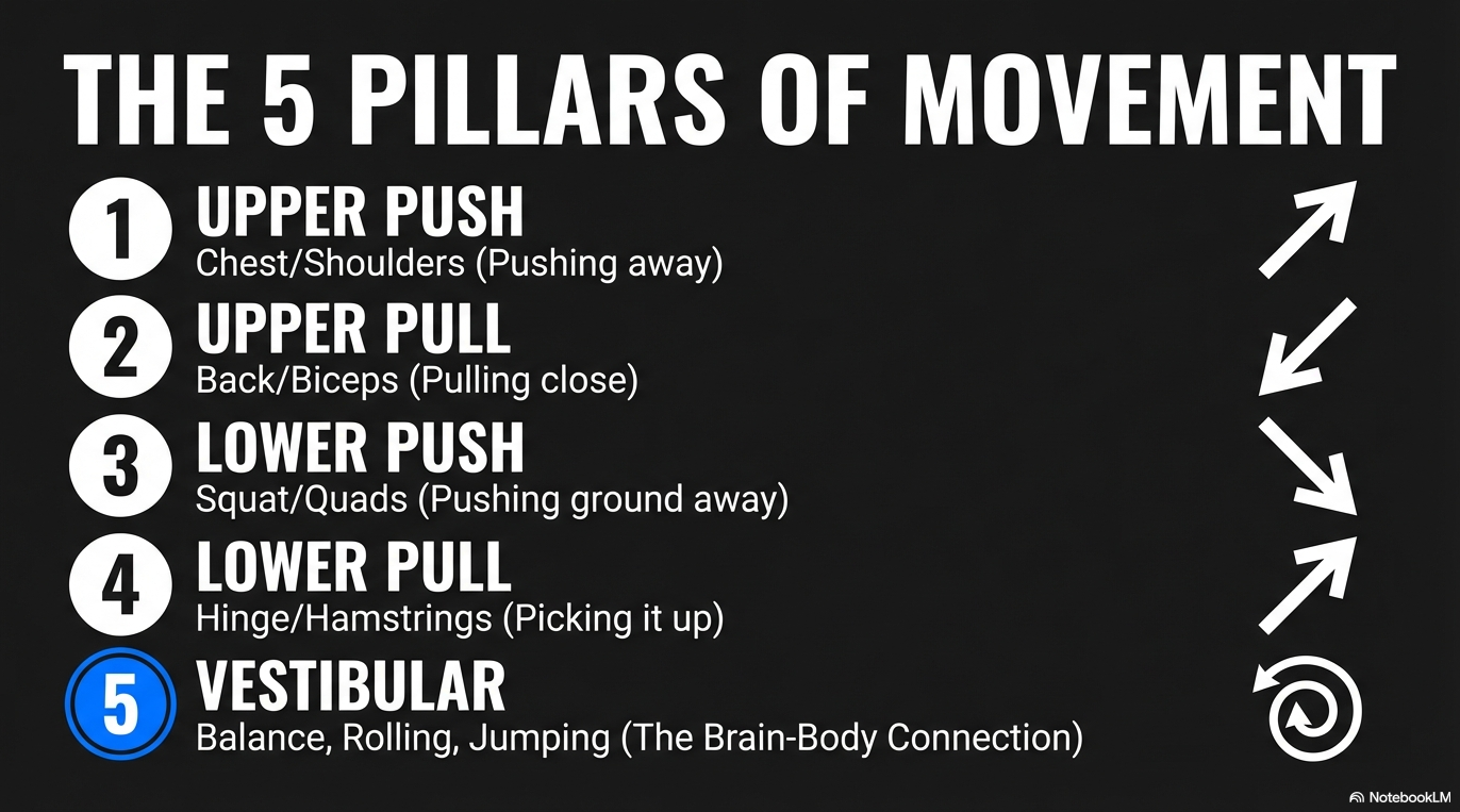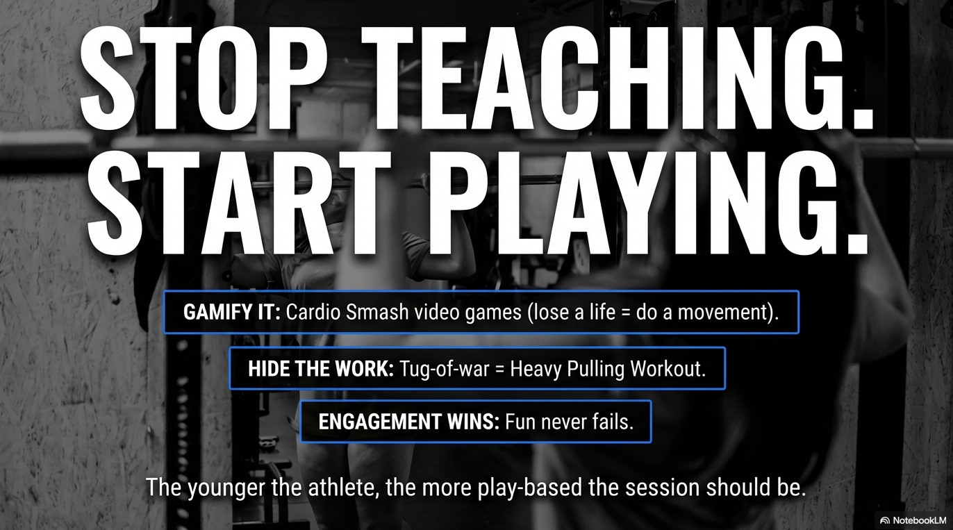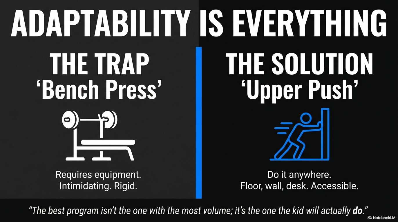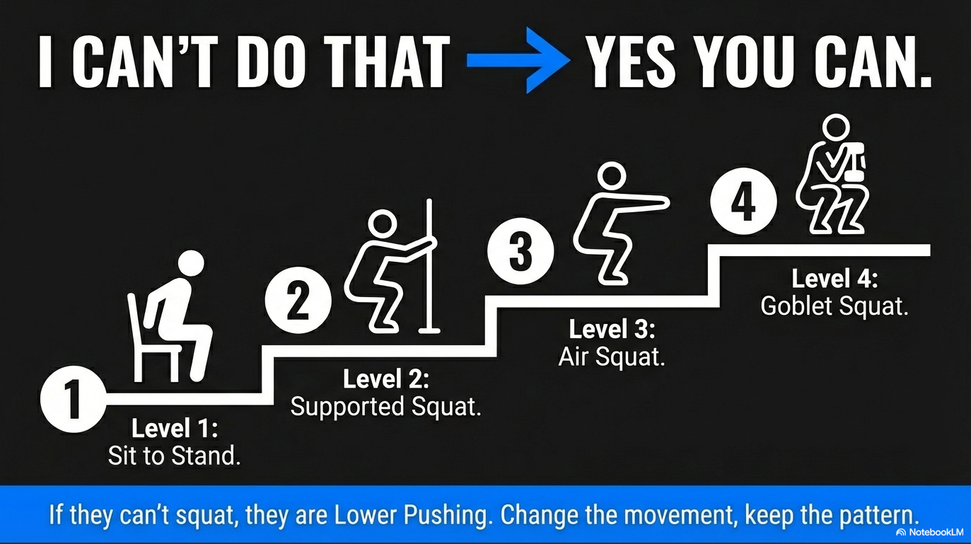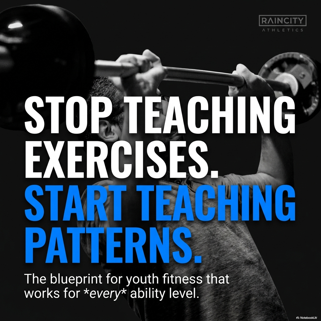 When you remove the obligation to try to get your athlete to complete a speicifc movement, you unlock an infinite number of scaling options, gamifcations, or other ways to engage with your athlete. Our goal isn't to get them to performan a specific exercise, our goal is to get them to perform a vareity of movement patterns.This is the simplest breakdown of patterns in a way that covers every muscle in the body. The more experienced you get, the more you can begin to break this down into muscle groups and other details - but to start, learn to understand the major patterns of the body rather than trying to memorize specific exercises.Not everyone can squat, but almost everyone can perform SOME type of 'Lower push' exercise. If you can walk up stairs, sit on the toilette, or even just bend your knees through any range of motion - then you're able to perform the lower push pattern. The goal isn't exercise for the sake of exercise, the goal is to accomplish a broad variety of movements and to work just 10% harder than they want to or have before. With this approach, there is an infinite number of ways to engage your athlete in a way that is fun rather than a chore.The best workout for your athlete is the one that they do. Don't overcomplicate it or set the bar unnattainably high. 30 minutes once a week is 1,000x better than nothing, and 30 minutes 2x / week consistently over an extended period is enough to make some major life changes for athletes of any age or ability.Exposing our body to stress in a controlled enviornment, whether physical or emotional, is how we adapt and grow as human beings. Teaching regulation to athletes through their phyiscal body is MUCH easier then trying to get inside their heads, but as they learn physical regulation, the emotion regulation follows right behind.If you're working with an athlete who spends a lot of time already doing a specific sport (or movement pattern) then if you remember our goal of ensuring athletes complete a broad range of patterns - then our most effective use of time to ensure a balanced and health athlete is to train the ones they're not already doing. The goal is long term progression, not short term goals. Don't scare them off by making it too hard. As long as you can get your athlete to do 10% more than they wanted to, or have before - then the workout was a win. Maintain this approach over extended periods of time, and the results will speak for themselves.